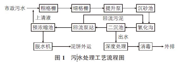 某城鎮(zhèn)污水處理廠,2008年開工建設(shè),一期設(shè)計(jì)處理規(guī)模為6.0×104m3/d,采用2000型改良氧化溝工藝,設(shè)計(jì)進(jìn)水水質(zhì):CODCr≤350mg/L,BOD5≤150mg/L,SS≤200mg/L,NH3-N≤30mg/L,TN≤40mg/L,TP≤5mg/L,出水標(biāo)準(zhǔn)為GB81918—2002一級A排放標(biāo)準(zhǔn)。該工程主要設(shè)計(jì)工藝參數(shù)為:污泥負(fù)荷0.059kgBOD5/(kg·MLSS·d),容積負(fù)荷0.295kgBOD5/(m3·d),污泥齡18d,設(shè)計(jì)水溫較高30℃、較低13℃,水力停留時(shí)間18.4h。該污水處理廠2009年5月開工建設(shè),2010年11月建成投運(yùn),其工藝流程如圖1所示。