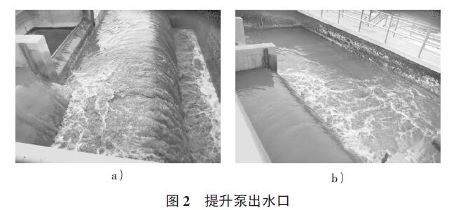 1)降低進(jìn)水跌水曝氣強(qiáng)度,減少進(jìn)水溶解氧對系統(tǒng)的影響。該污水處理廠分兩期建設(shè),在進(jìn)行一期建設(shè)時(shí),預(yù)處理工段構(gòu)筑物即按12.0×104m3/d的規(guī)模一次建成,在污水提升泵站處設(shè)置一期、二期配水井一座,如圖2所示。配水井設(shè)置有提升泵出水口、消能槽和配水槽,一、二期的配水量通過配水槽出水閥門進(jìn)行調(diào)節(jié)。由圖2a)可看出,經(jīng)過提升泵提升的廢水經(jīng)過兩次跌水,一次是出水口到消能槽的跌水,跌水高度約計(jì)500mm;另一次跌水在配水槽處,跌水高度在900mm左右。