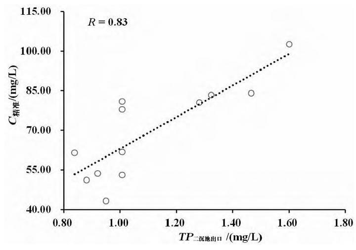 擬合線性回歸方程得C精準(zhǔn)=59.833TP二沉池出口+3.2527(γ=0.83),回歸曲線如圖3所示。經(jīng)計(jì)算γ=0.83,取α=1%,查數(shù)理統(tǒng)計(jì)表可知γ(12)=0.697。因γ>γ(12),由此線性回歸顯著,兩者線性相關(guān)較好。